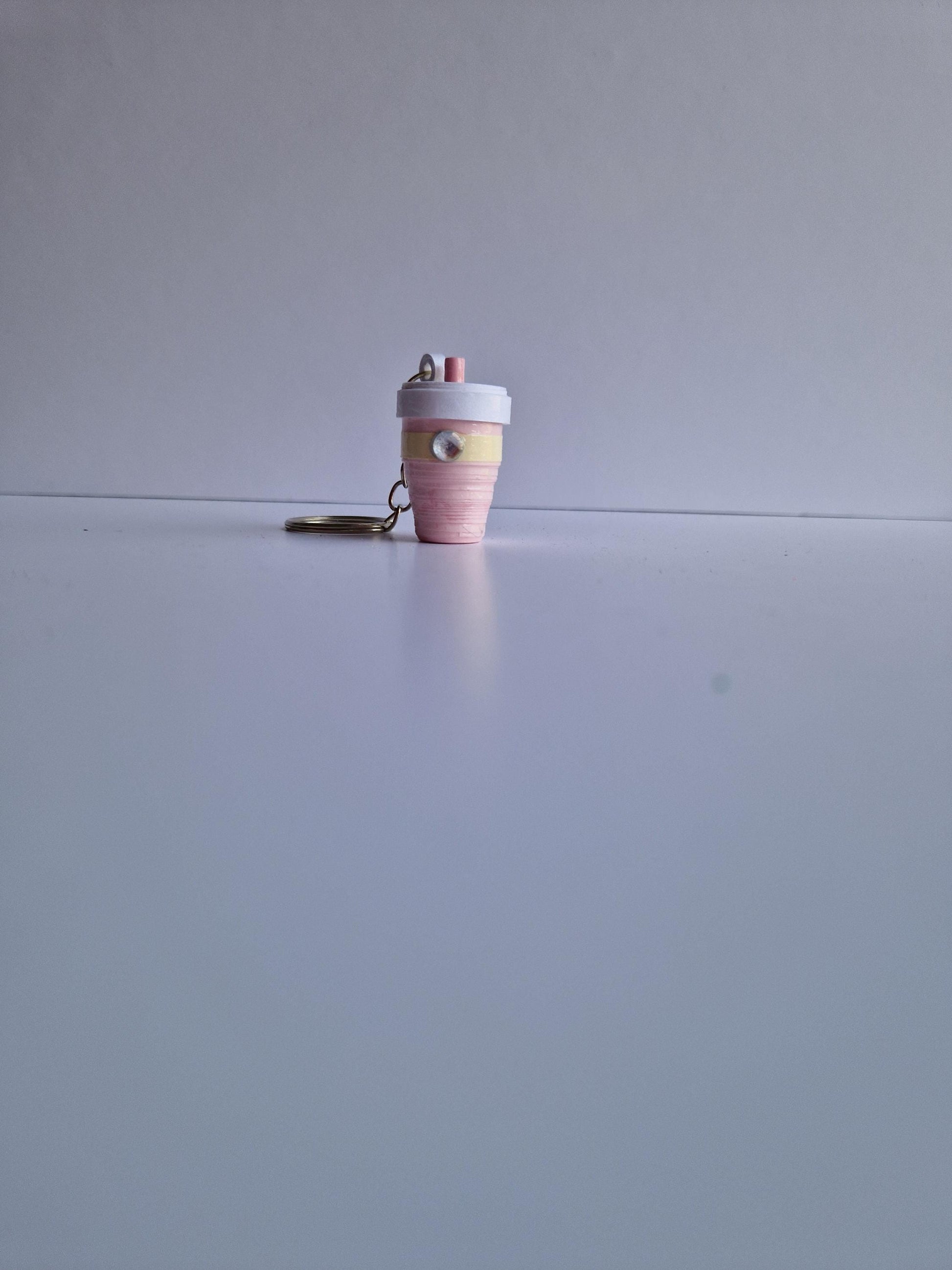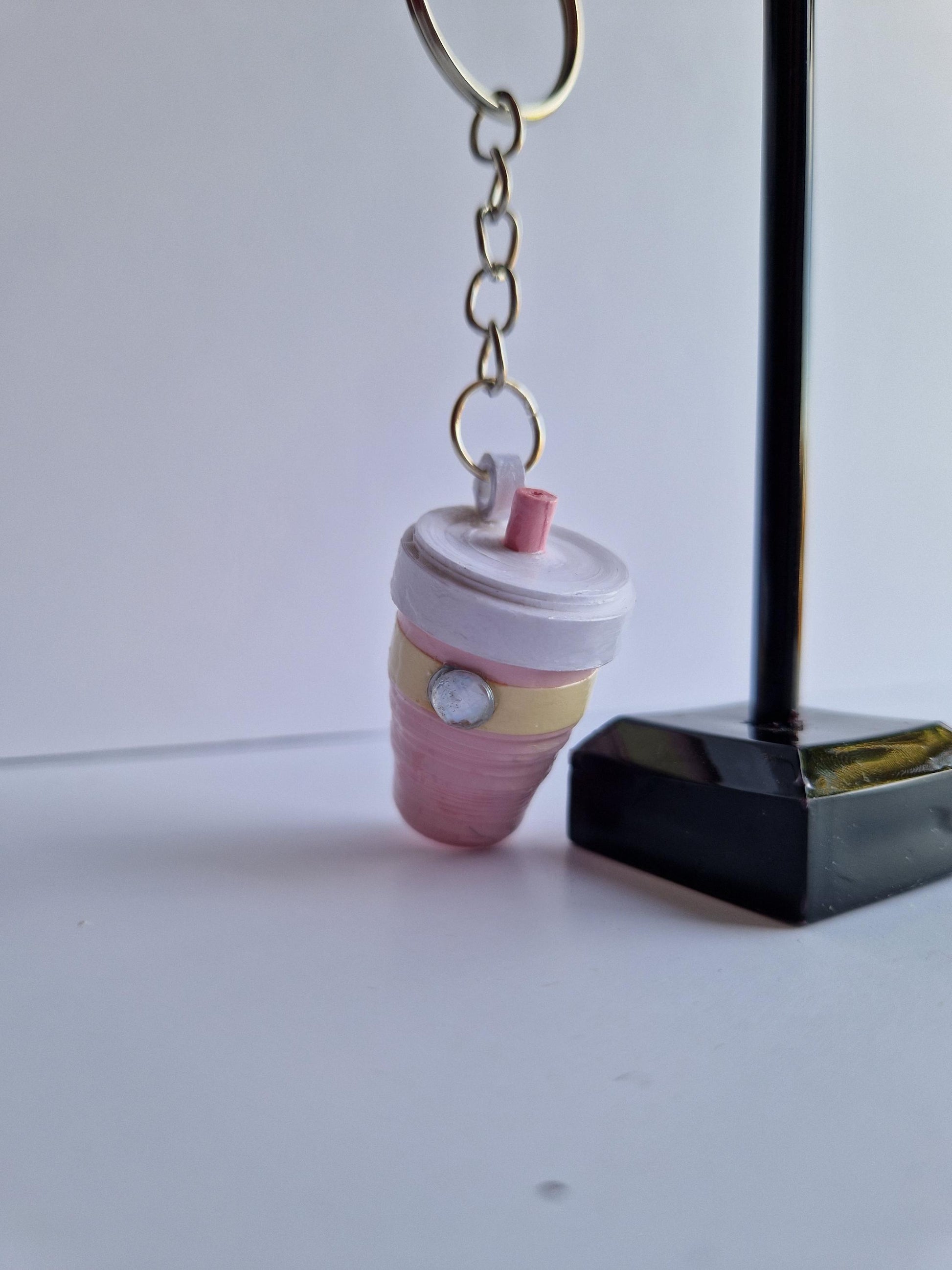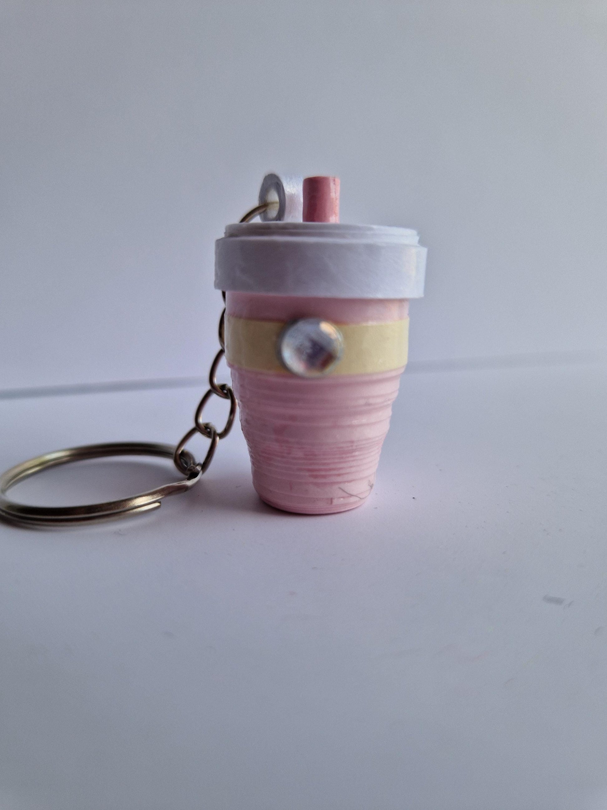 Quilled Paper 3D Pink Travel Cup Keyring. A cute little cup, shaped by hand using the traditional artwork of paper quilling, also known as Filigree.