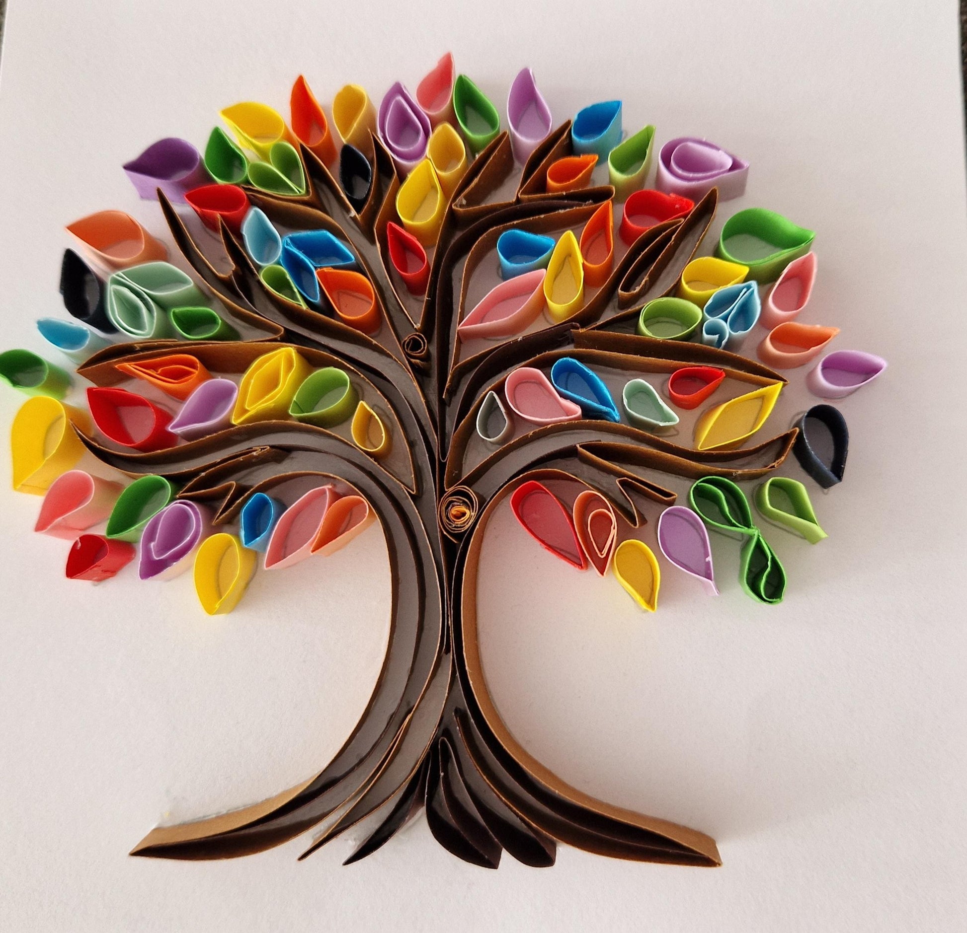 Free Delivery Quilled Paper Wall Art Framed Tree with many individual colourful leaves and branches shaped by hand using the traditional artwork of paper quilling, also known as Filigree.